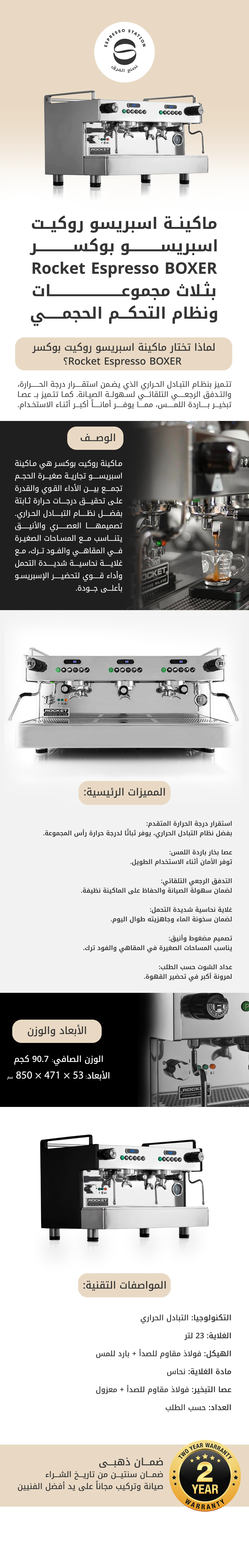 أداء قوي وتحكم حجمي موفرة للجهد وموقتات للجرعات مدمجة في مساحة صغيرة ؛ تعد ماكينة اسبريسو روكيت بوكسر Rocket Boxer أحد أفضل الخيارات للمقاهي منخفضة إلى متوسطة الحجم. مجهزة بكل ما يحتاجه الباريستا (صانع القهوة) للحفاظ على تدفق القهوة - بما في ذلك عصا بخار ذات ملمس بارد وصمامات خلط الماء الساخن وغلاف مقاوم للصدأ سهل التنظيف. كل هذه الوظائف مغلفة في تصميم مضغوط وأنيق يستوعب المساحات الأصغر بينما يبرز بين البقية.